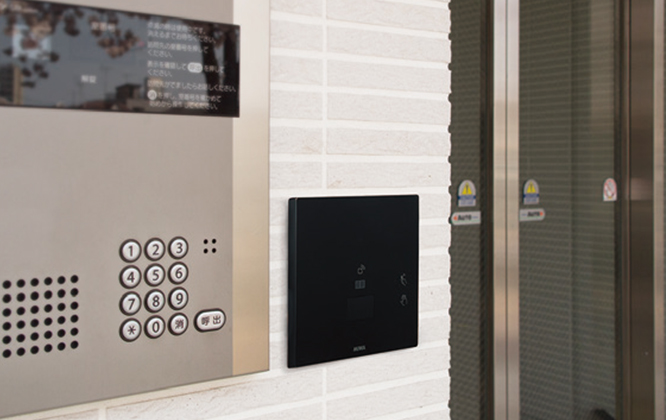共用エントランスのオートロックも、住戸玄関と同じMIFARE PlusカードまたはFKLカードで解錠が可能です。
